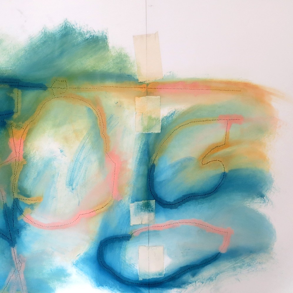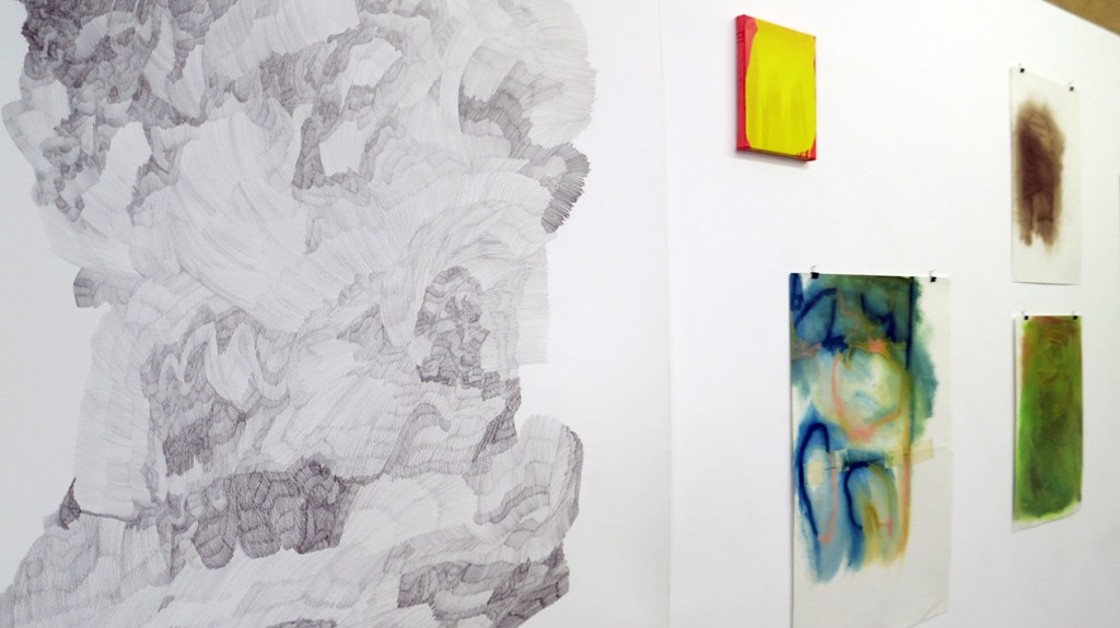 Enfin, Nous retrouvons avec plaisir le travail d’Anne Pons, toujours autour de la forme bien sûr, mais aujourd’hui des propositions mi-dessins, mi-peintures sur papier. Nous y voyons, via des poncifs de papier reprenant les contours et perforés, des tracés d’anciennes formes « revenir » et se mêler à des surfaces peintes d’aujourd’hui. Ce processus reporter-répéter-appliquer trouve un écho dans un dessin crayonné qui est présenté, fruit d’un travail où la main trouve sa trace dans l’instant, en totale autonomie…