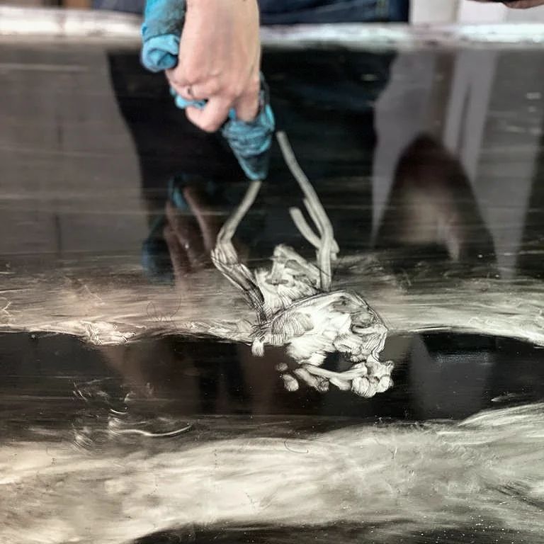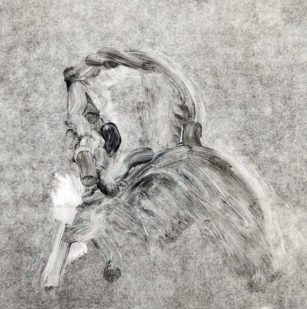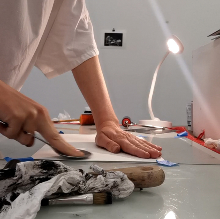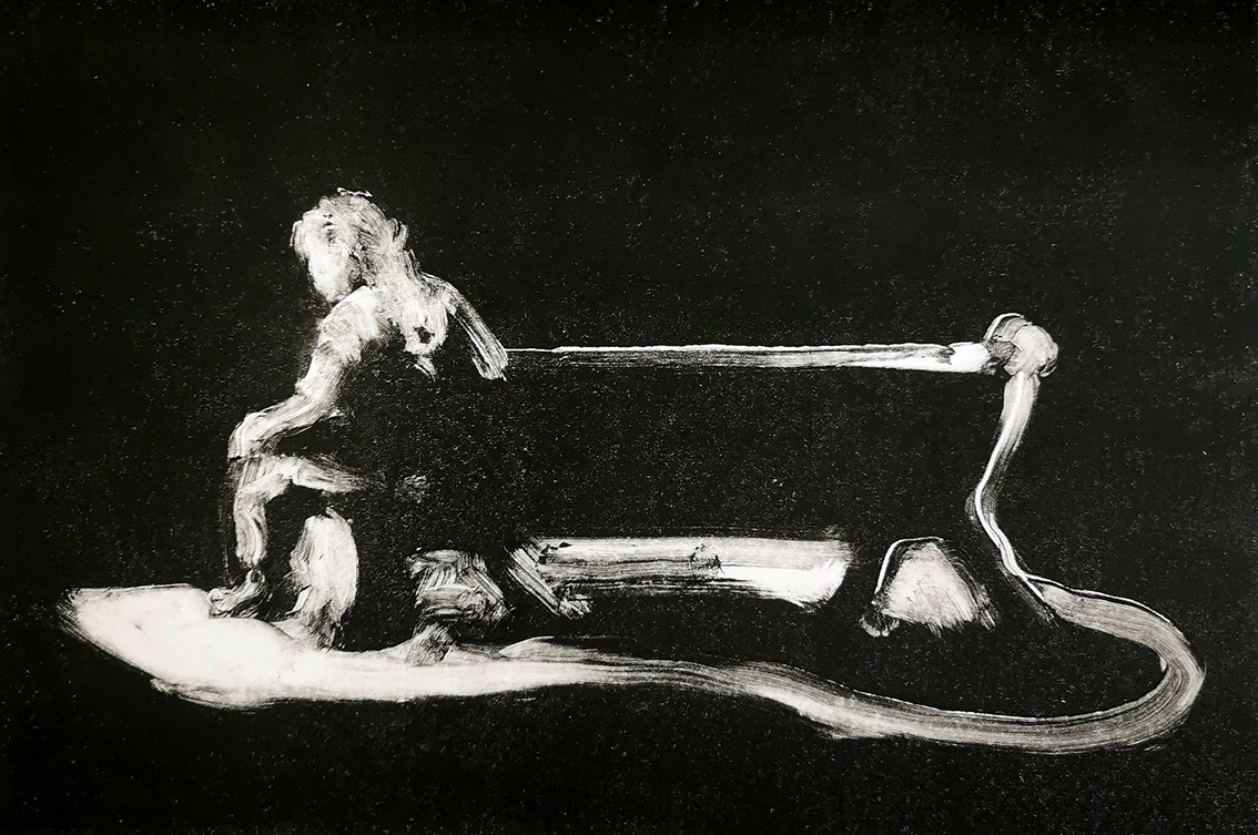 Originaire de la région, Coline Casse mêle l’affect qui la lie à la ville de Montpellier par le souvenir lointain d’une discussion sur un banc, et la thématique du double. Elle renoue avec le plaisir pictural du monotype, qui laisse derrière son tirage, une trace dite « image fantôme ». En arpentant les rues pour constituer une base de travail photographique, c’est aussi une sorte de fantôme que l’artiste cherche à faire apparaître en figurant des discussions intimes, avec soi-même, sa part d’ombre, ou une forme d’alter ego fantasmagorique. Le titre de cette série fait écho à la nouvelle L’autre extraite du Livre de sable, de Jorge Luis Borges, où le narrateur lors d’une promenade se rencontre lui-même dans un autre espace-temps.