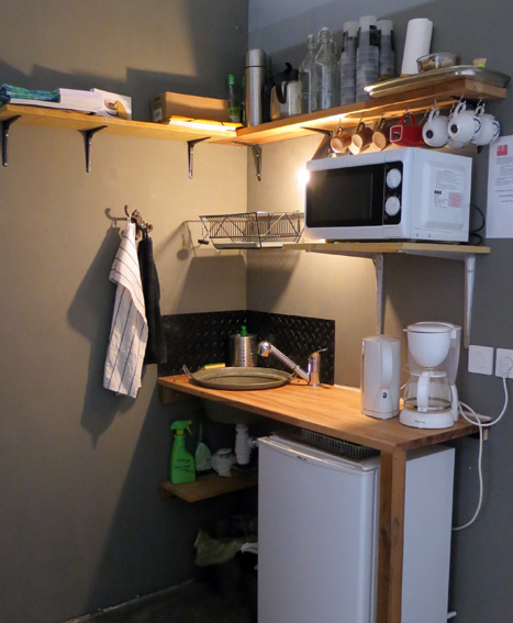 – l’accès kitchenette (réfrigérateur, four micro-ondes, évier, bouilloire, cafetière, bouteilles thermos, carafes, éco-cups, quelques plats et couverts)