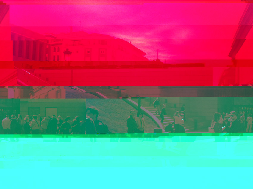 Le glitch génère quelque chose d’abstrait, de fantasmatique, d’utopique, d’inexpliqué, de poétique de par les jeux de pixel et jeux de couleur qu’il produit. L’émission devient d’une certaine façon abstraite, mélangeant les informations de la machine pour en modifier l’image. L’électricité manifeste, trouble, déconstruit, reconstruit, créant comme un stand by dans la médiatisation. Le média devient médium…